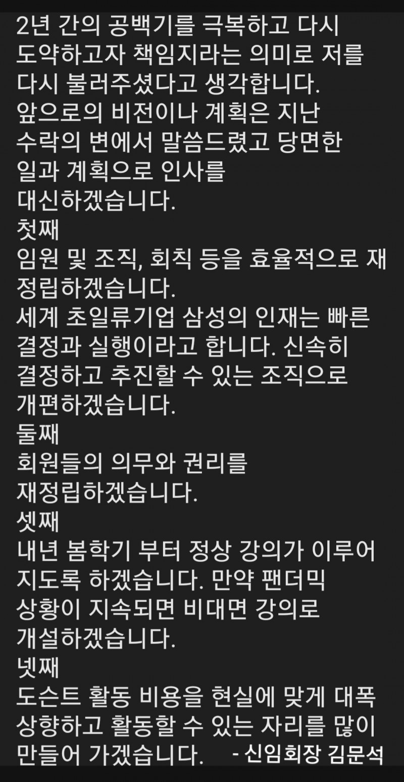 시작할 예정이라고 신임 김문석회장께서 밝히셨습니다. 우리 모두