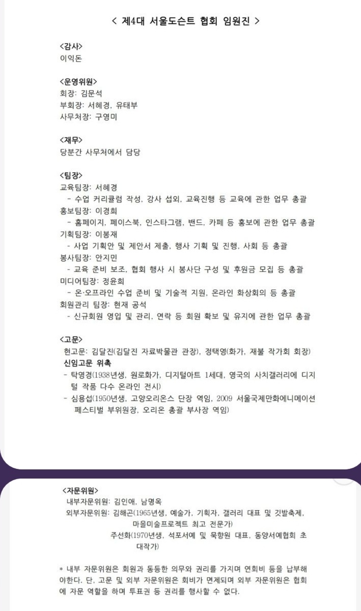 SDA 신임 임원 및 2022년 사업계획案 공지페이지 정보작성자 SDA 댓글 0건 조회 4,222회 작성일 21-12-31 06:10본문서울도슨트협회(SDA) 신임 임원 및 2022년 사업계획案~ 참고바랍니다, 첨부파일