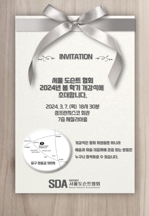 2024년 봄학기 개강식에 초대합니다.페이지 정보작성자 SDA 댓글 0건 조회 4,184회 작성일 24-03-03 01:15본문서울도슨트협회 2024년 봄학기 개강식에 초대합니다. 202.3.7(목) 18시30분 성프란치스코 회관 7층 체칠리아홀 댓글목록등록된 댓글이 없습니다.