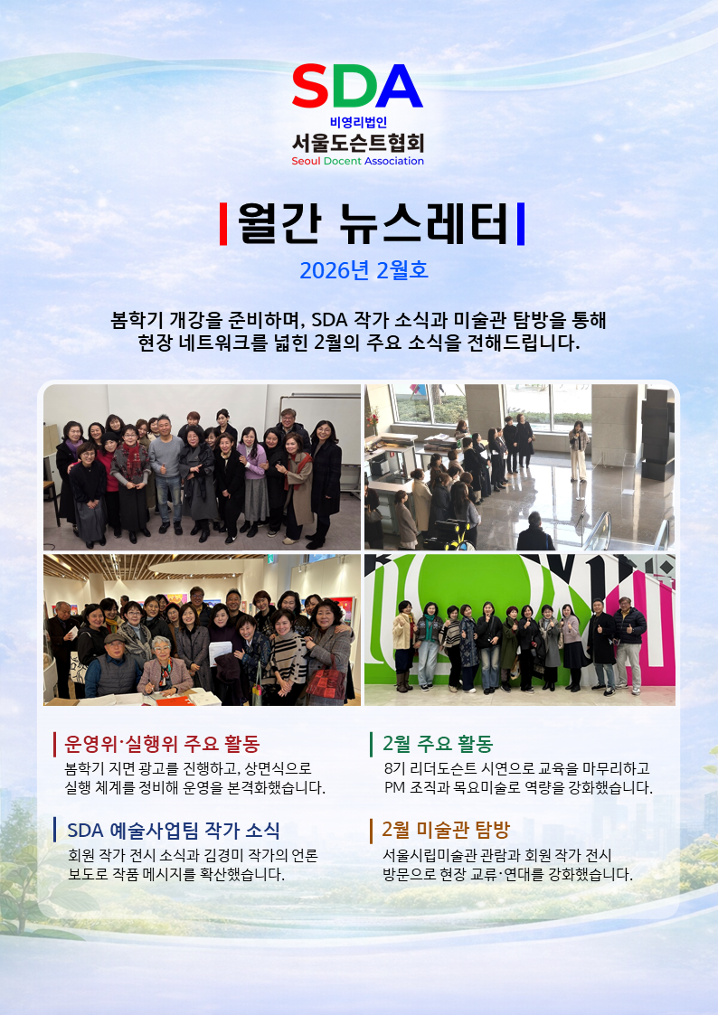 서울도슨트협회 월간 뉴스레터 2월호(1)페이지 정보작성자 SDA 댓글 0건 조회 368회 작성일 26-03-04 21:43본문서울도슨트협회, 월간 뉴스레터 26년 2월호 발간 [이 게시물은 SDA님에 의해 2026-04-05 02:38:42 공지/뉴스에서 이동 됨]