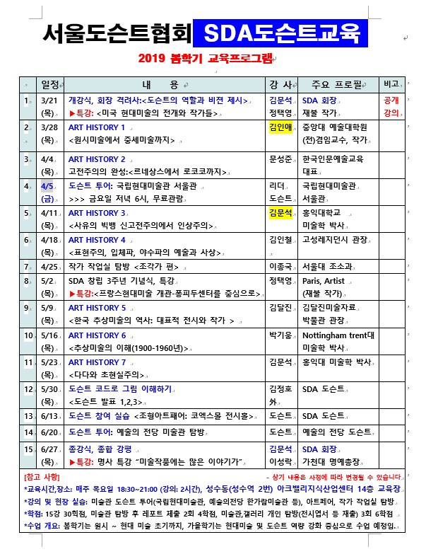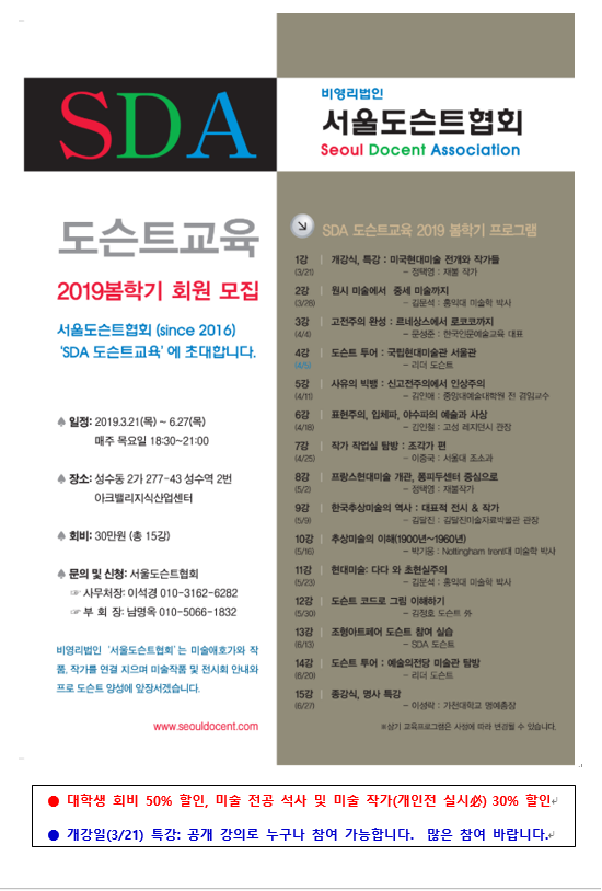 2019 봄학기 도슨트 교육과정 개강 페이지 정보 작성자 SDA 댓글 0건 조회 7,299회 작성일 19-03-26 00:26 본문 서울도슨트협회 2019년 1학기 교육과정이 3월 21일 성수동 아크밸리지식산업센터 14층 대강당에서 개강하였습니다. 목록 이전글SDA도슨트교육 2019봄학기 개강 특강 19.04.12 댓글목록 댓글목록 등록된 댓글이 없습니다.
