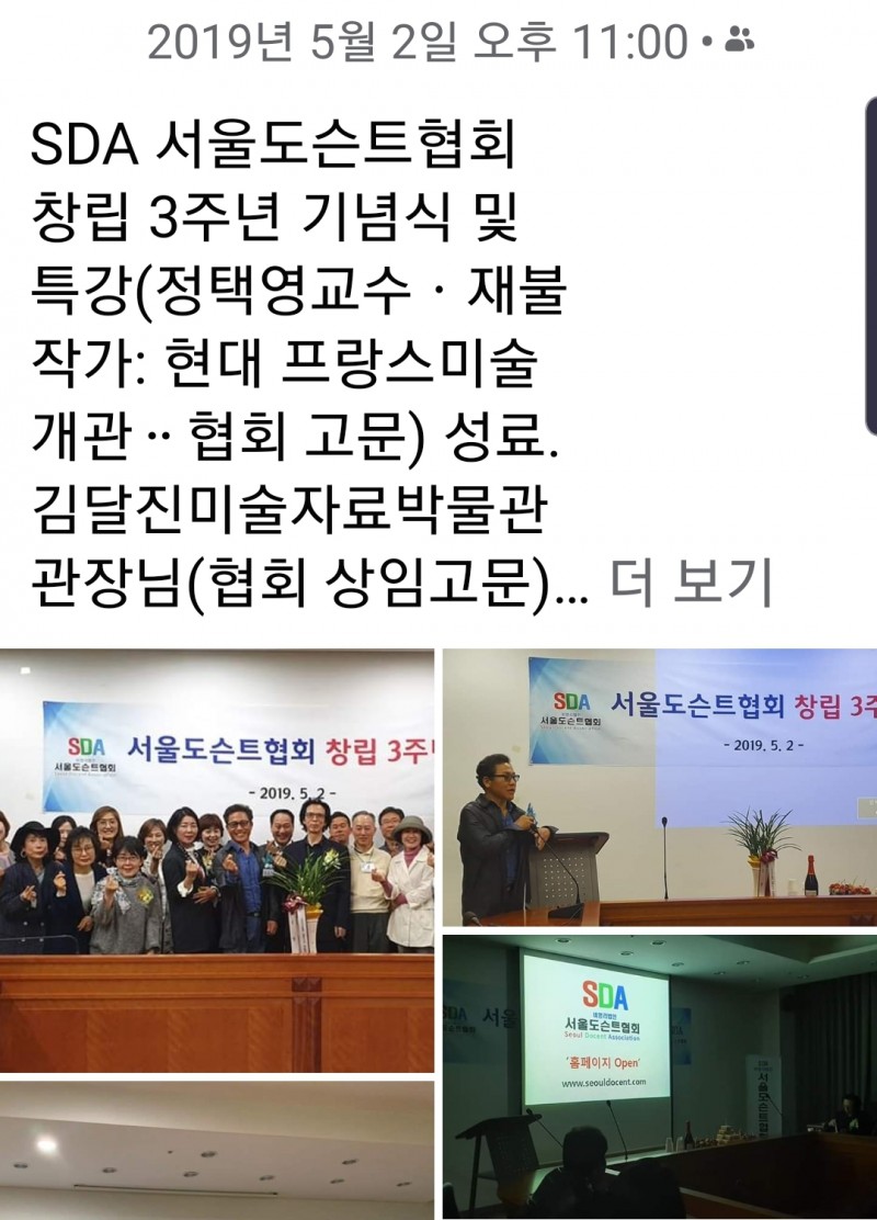 SDA 창립 4주년 기념일 축하^^페이지 정보작성자 SDA 댓글 0건 조회 8,451회 작성일 20-05-02 11:38본문비영리법인 서울도슨트협회 SDA가 2020년 5월 2일 창립 4주년을 맞이했습니다. 코로나19 여파로 별도의 창립기념 축하 행사는 없이 회원들와 미술관게자(작가, 갤러리스트, 콜렉터, 애호가) 함께 축하의 마음 나누고자 합니다. SDA 창립 4주년을 함께 축하~!! 댓글목록등록된 댓글이 없습니다.