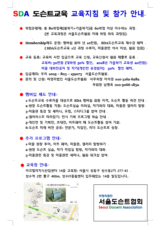 2019 봄학기 도슨트 교육 안내 페이지 정보 작성자 SDA 댓글 0건 조회 3,804회 작성일 19-03-25 23:30 본문 목록 이전글SDA도슨트교육 2019가을학기 안내 19.08.29 댓글목록 댓글목록 등록된 댓글이 없습니다.